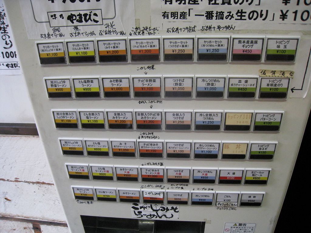 一般的な券売機とは上下逆なボタン配置の券売機。メニューは豊富に揃ってますね。