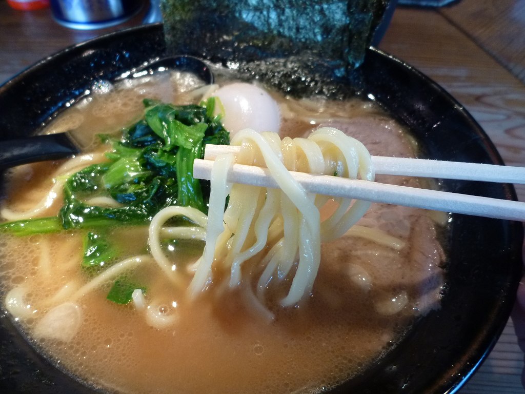 麺は酒井製麺の短めな平打ちの中太。家系の王道ですな。本店と同じく柔めですが