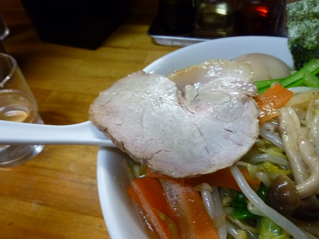 チャーシューは脂身のほとんど無い薄切りが1枚。ボソッとした食感です。