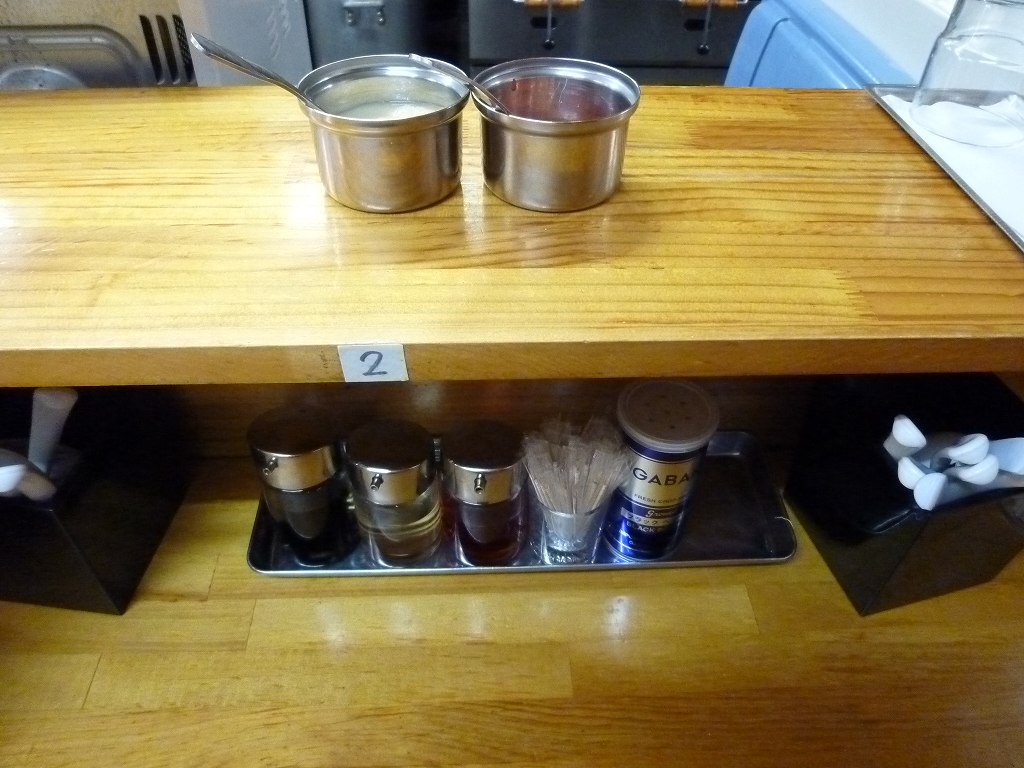 卓上には餃子用に胡椒とカウンター台には豆板醤とおろしニンニク。カウンター台の上に