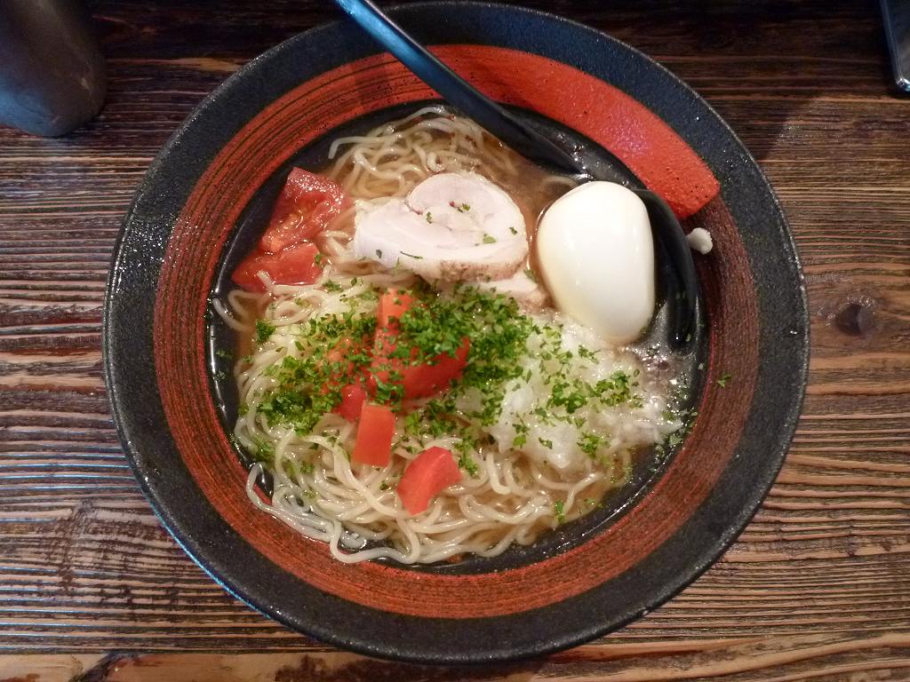 特製玉ネギダレにトマトの赤・みじん切り大葉の緑が映える夏向き爽やかなルックスです。
