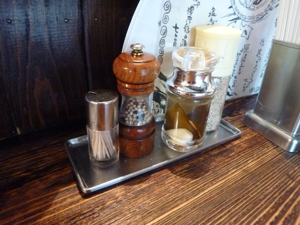 座った場所の関係で前回撮れなかった卓上。ニンニクと唐辛子の入ったお酢が特徴的です。