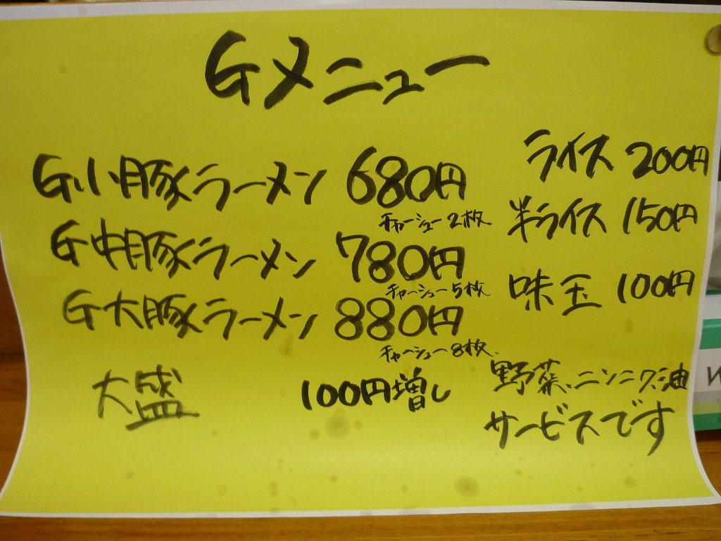 メニューは『G系』なる二郎インスパイア1本勝負。野菜・ニンニク・油は注文時に尋ねられます。