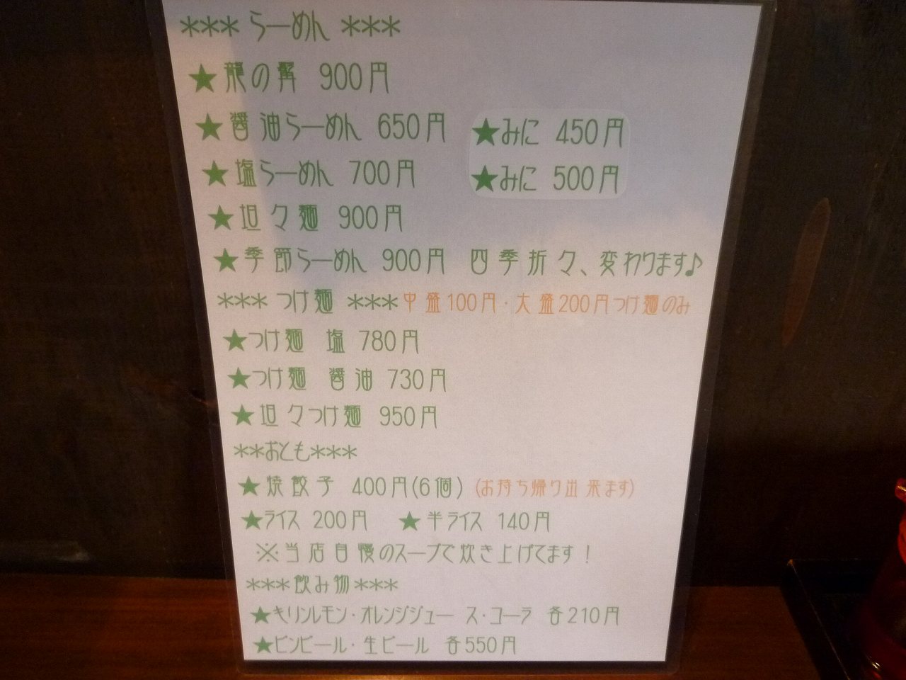 券売機の写真を華麗に失敗したんで卓上のメニューで。四季折々で限定らーめんを出すんですが
