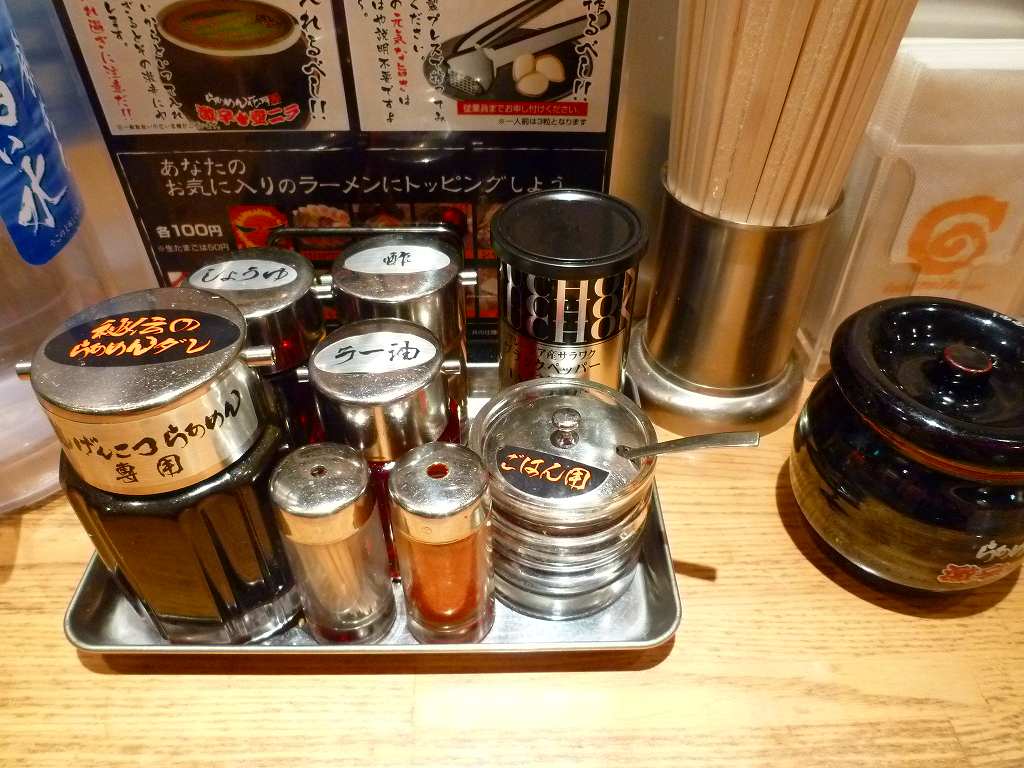卓上では醤油ダレと辛ニラが特徴的ですね。せたが屋なつがお¥720+半熟味玉¥100