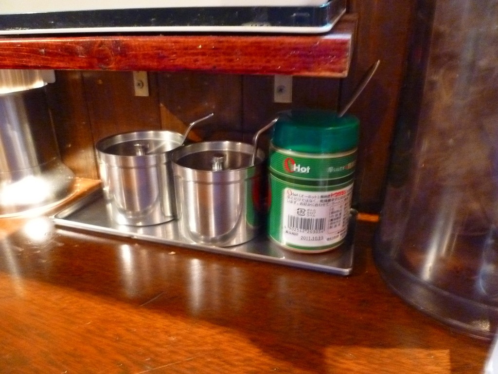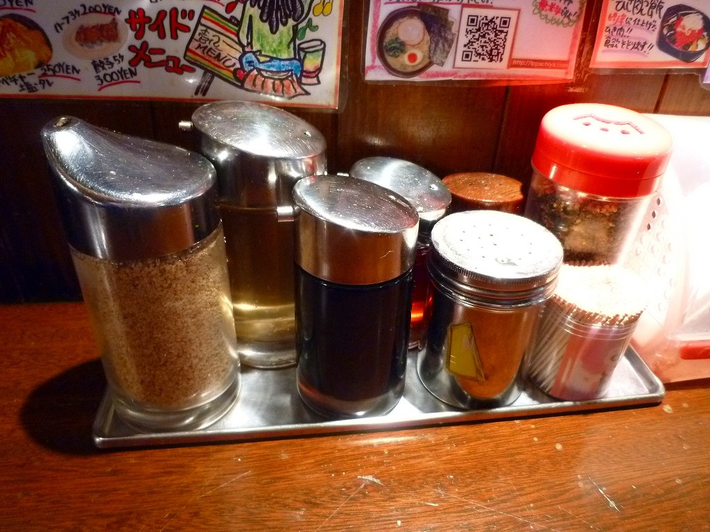 卓上は各種調味料の他に揚げニンニク粉と刻みニンニク、生唐辛子。生姜があれば嬉しいところ。