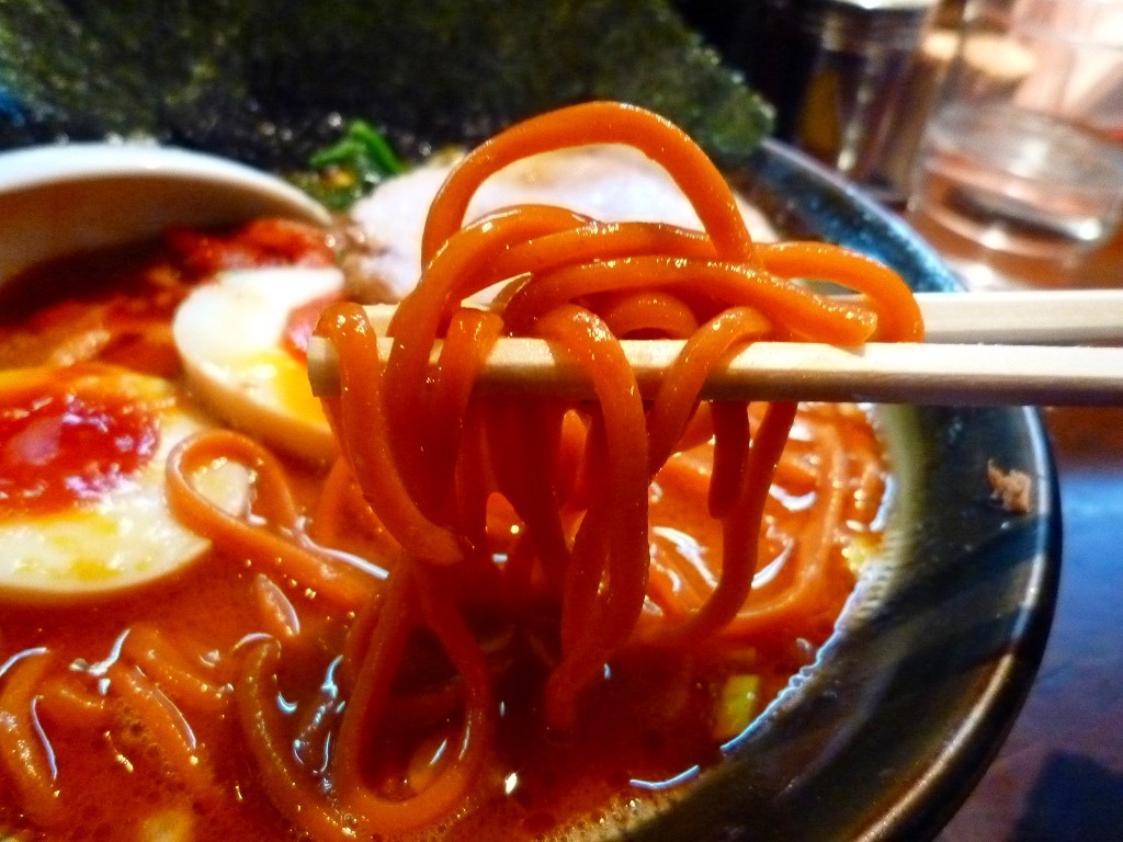 麺は唐辛子を練りこんだ中太ストレート。デフォの麺とは形状も異なり角断面です。