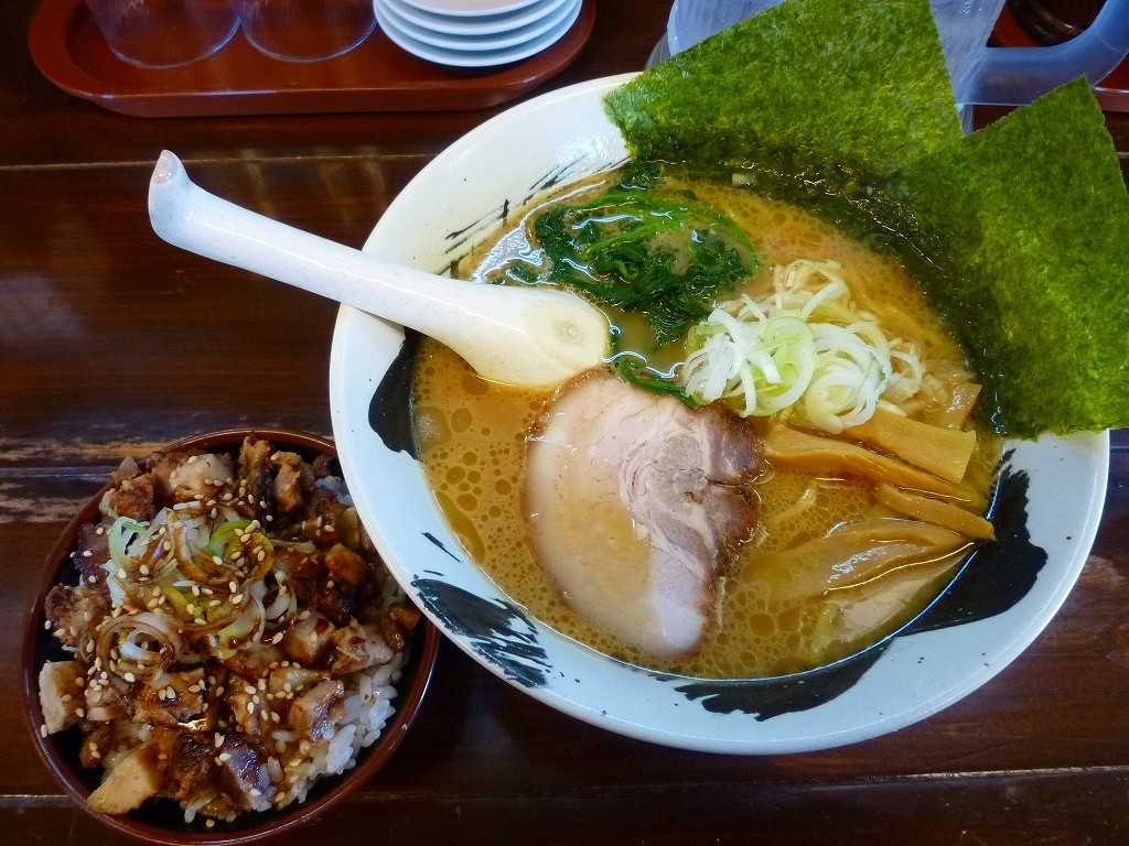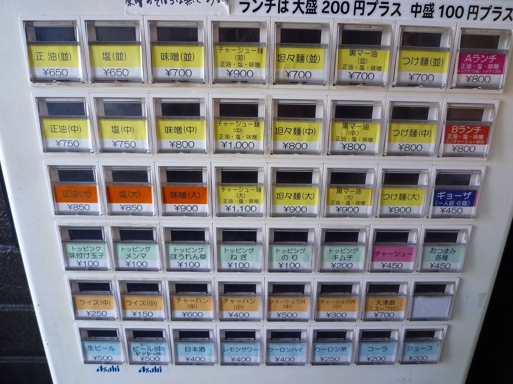 お店に入ってすぐ左、風除室の部分に券売機があります。基本はやはりとんこつ醤油のようですが同額で塩、50円増しで味噌もあって坦々麺もやってます。平日休日問わずでランチセットもあるんですがこちらは同額で正油・塩・味噌から選べるようになってます。天津飯があるんで中華屋寄りなのかと思いきや最近になって牛丼もリリースしてるのにはぶったまげました。しかも600円て。どこに進もうとしてるんだぜ?