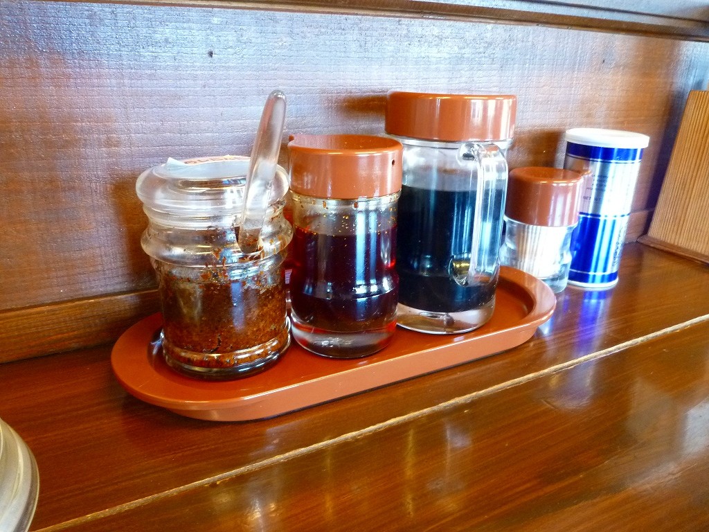 卓上には胡椒と醤油にラー油とからしにんにく。Bセット・正油¥800