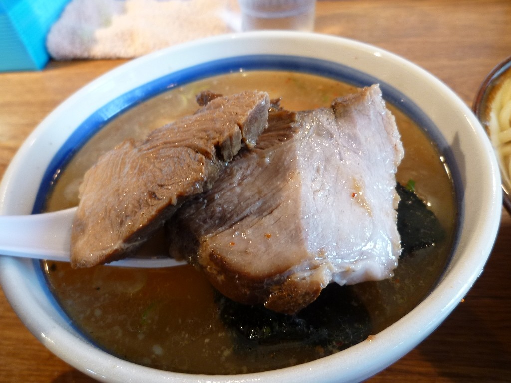 チャーシューは肉塊と表現しても差し支えなさそうなのが2個。つけ汁の器としてはかなり大きい容器と比較してその大きさがわかるかと思います。しっかり歯応えで煮込まれた感はしませんが肉を食ってるって充実感は申し分なし。脂身が少ないのも好印象です。