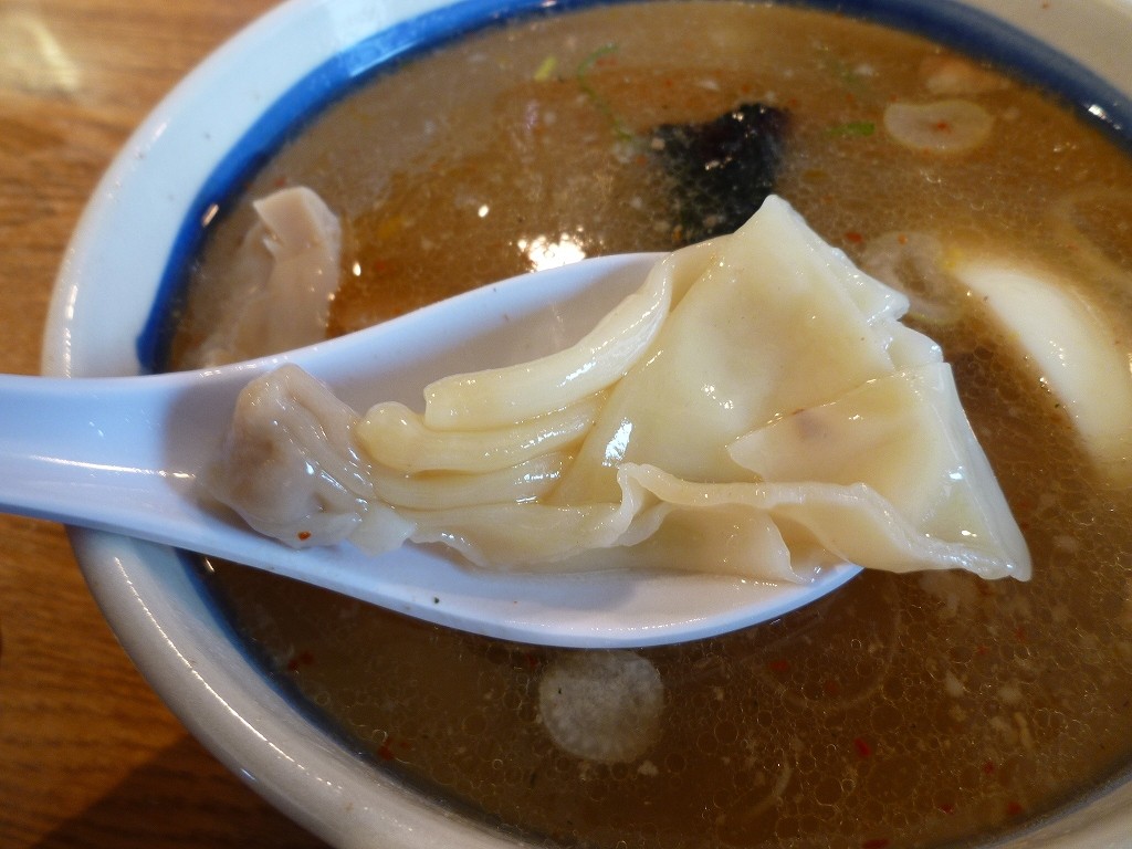 追加トッピングのワンタンはなんとも珍しいカタチ。こんなワンタンは初めて見ましたがしっかりめな皮と生姜の効いた具がそれぞれに感じられて美味しかったです。ちゃんと数えてないですが3個か4個は入ってたかな。CPは高いと思います。