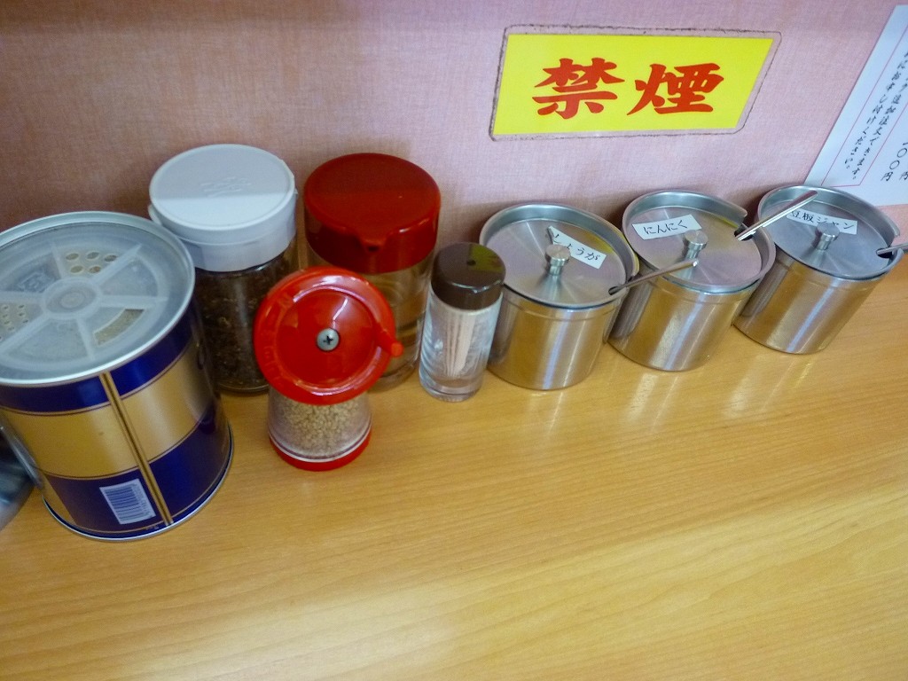 卓上には家系基本調味料の他に生姜も完備。ひっそりとご飯用のふりかけもあったりします。