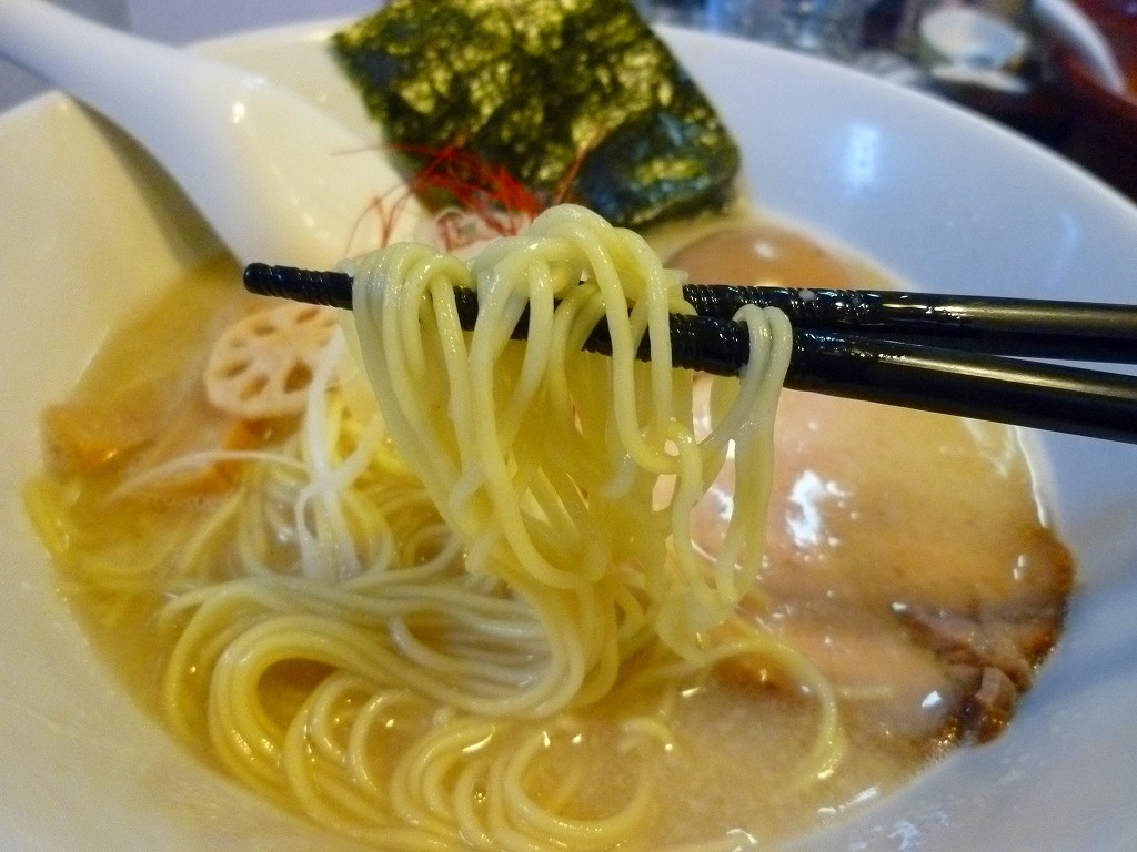 ザルで背脂を漉したあと注がれるスープです。鶏も使ってるそうですが感じるのは圧倒的に豚骨ですね。とはいえ臭みは皆無でマイルドな口当たり。調味料ではない自然な甘みが心地よいです。