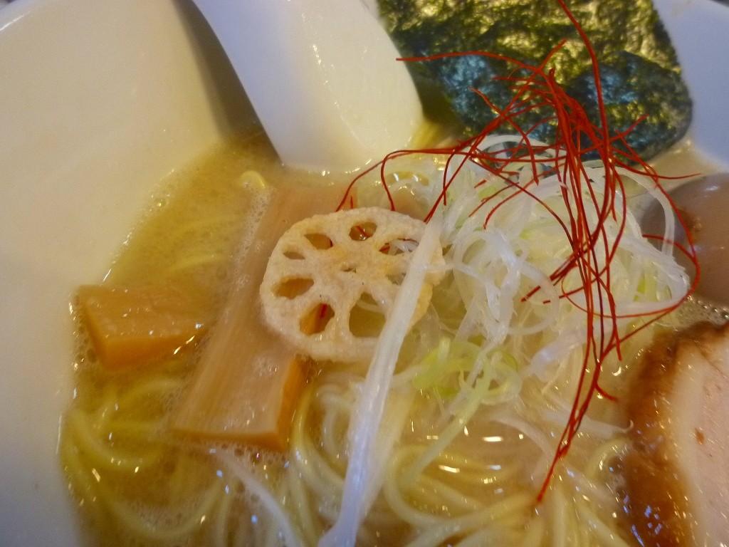 店名にかけてるのかレンコンチップが特徴的ですか。メンマは柔らか食感で国産白髪ネギはネギ辛さもなく共にいいアクセントとなってます。