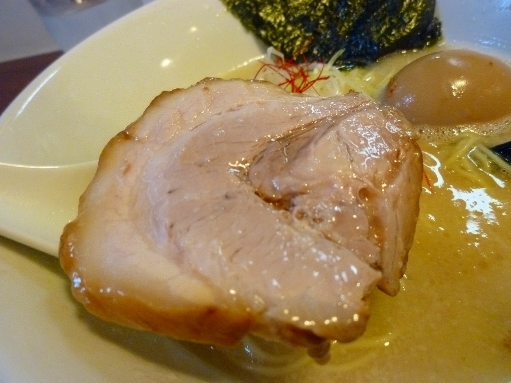 チャーシューは厚切り巻きバラが1枚。ほど良い味加減に脂身とろりのオニクはしっとり。1枚あたり100円なら十分お得に思える出来栄えです。