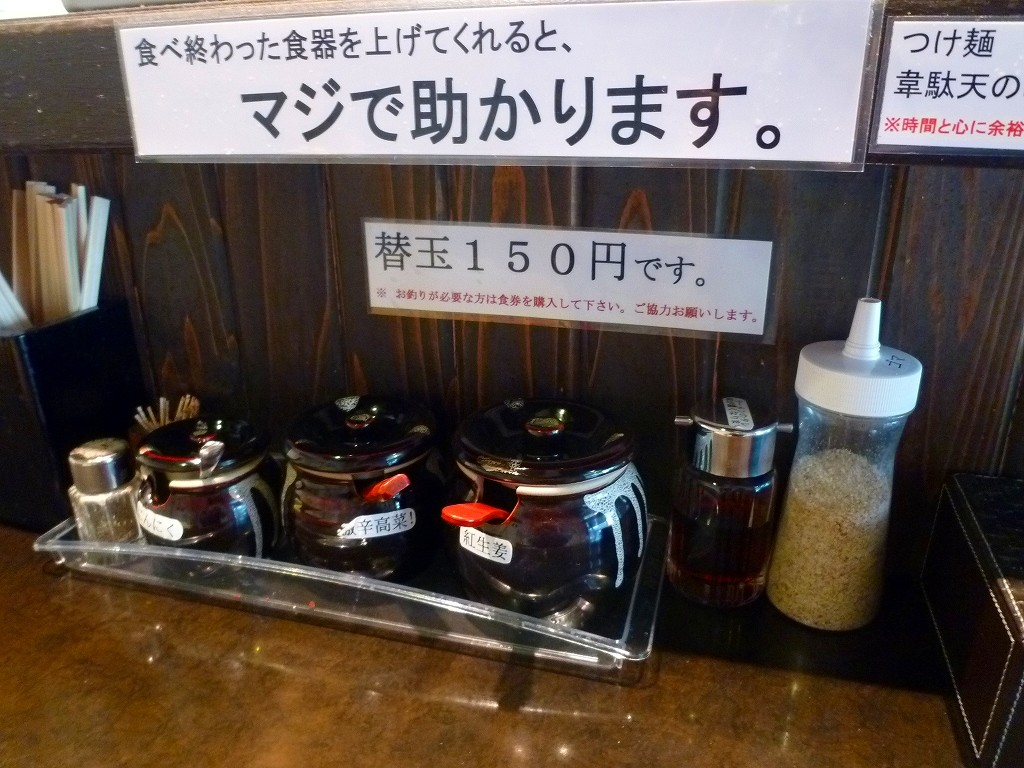 卓上には胡椒・にんにく・激辛高菜・紅生姜・ラーメンのタレにゴマ。あれ?しんぎょこ止めちゃったのかな、あれけっこう好きだったんだけど。まま、食べ終わった食器をカウンター台に上げるとマジで助かるらしいんで上げてあげましょう。韋駄天の醤油¥650+味付玉子¥100