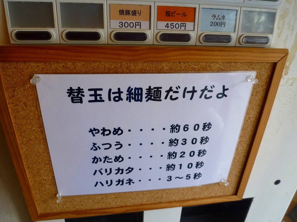 券売機の下には麺の茹で時間表示。ハリガネ3〜5秒って。そんな短いんだぁ。