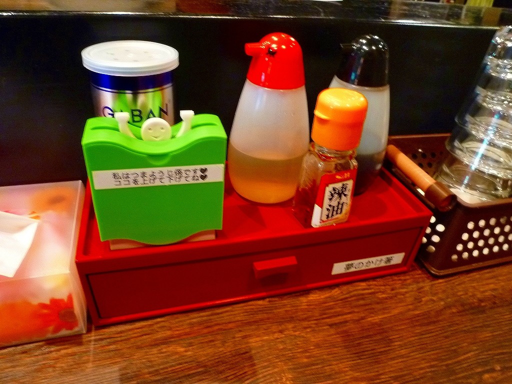 卓上調味料は餃子用3種に胡椒。つまようじ係が可愛らしいです。他に替玉用のラーメンダレがカウンター台の上に。ちょっと遠かったんで撮れなかったんですがつけ麺用割りスープのポットがかなりオサレなんですがこれはお店で見てもらったほうがいいでしょうね。