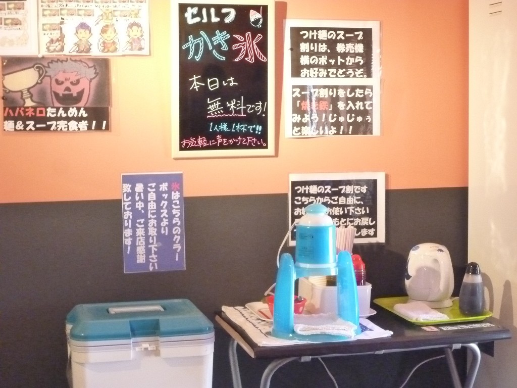券売機の横にはつけ麺の割りスープが用意されてるんですがなんとビックリ、かき氷の無料サービスなんてやってるじゃないですか。『本日は』とあるんで毎日ってわけじゃないんでしょうけど。
