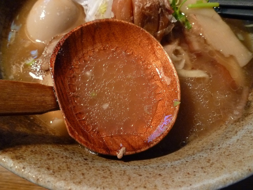 麺は平打ち中太強縮れ。ピロピロながらクキッとした歯応えを残した面です。もう一つの低加水細ストレートもいいんですがこの麺を食べないと一期一会に来た気がしないというか。