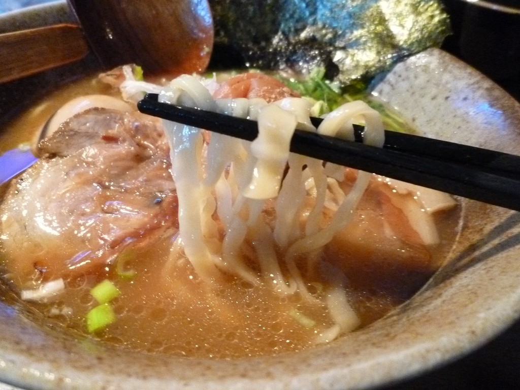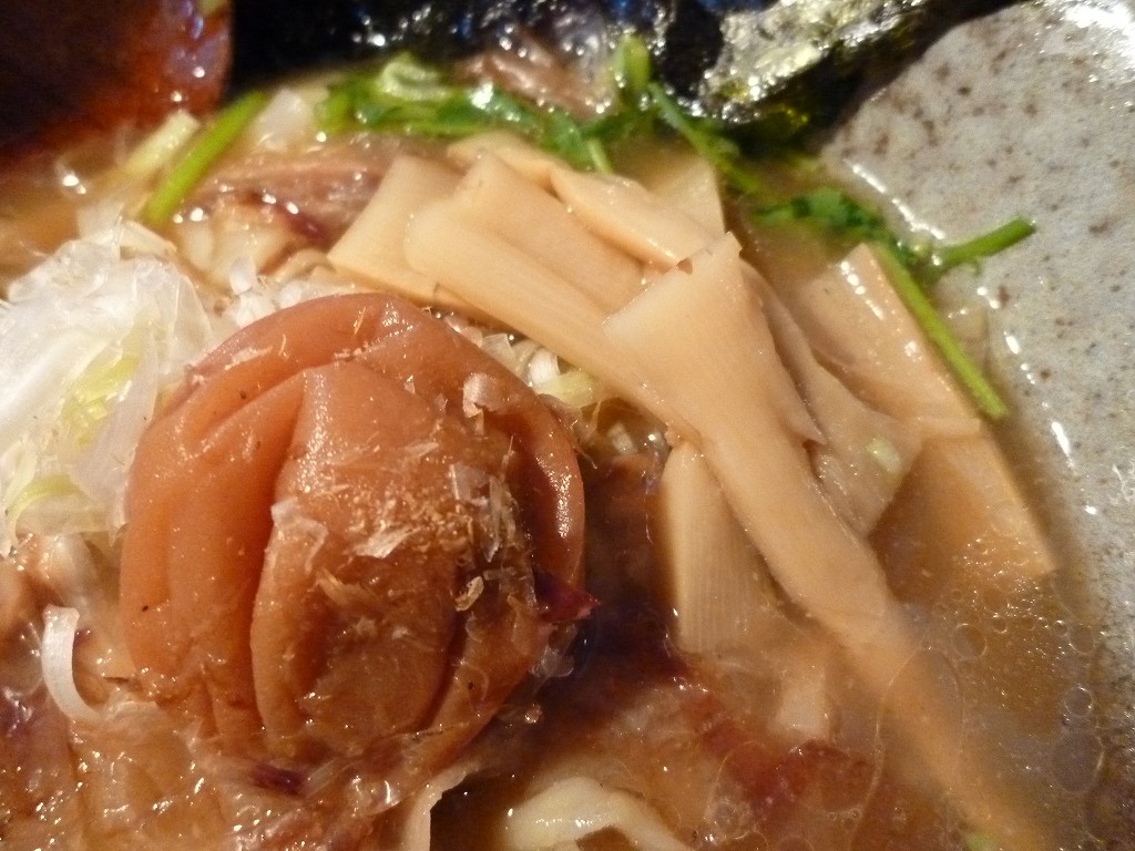中央に鎮座する南高梅は酸っぱすぎなく香り高い梅干し。若干スープには溶けにくいんですが爽やかさを感じるには十分過ぎる役割りを演じます。メンマは普通なカンジのが多めに入るようになりました。これはハッキリ言って前の極太のほうが好みですか。