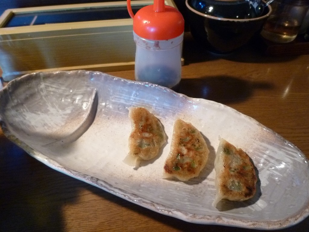 味玉はダシ味しっかり塩気控えめの味付けが黄身まで染みてます。時間をかけて仕込んでるのが窺えますな。餃子(3個)¥180