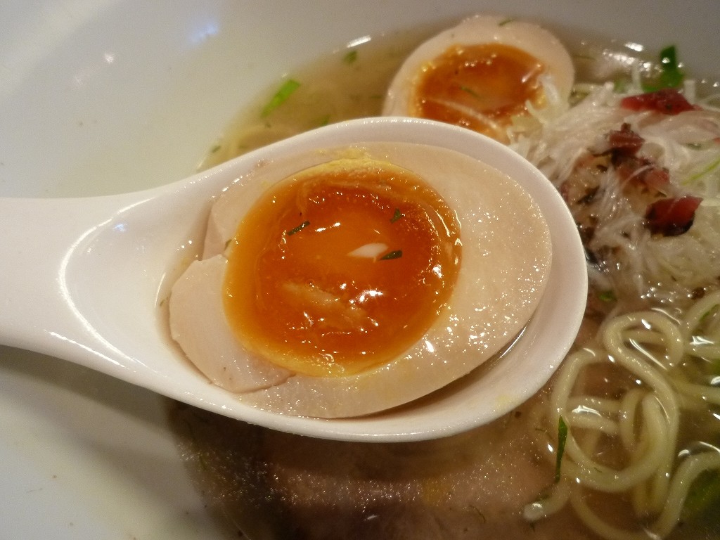 トッピングした味玉はダシと醤油と甘めな味付けが黄身までしっかり。塩気と甘さのバランスが秀逸な上に半熟加減が絶妙なんで玉子の味も感じます。提供前に温めてくれるのもポイント高いですね。