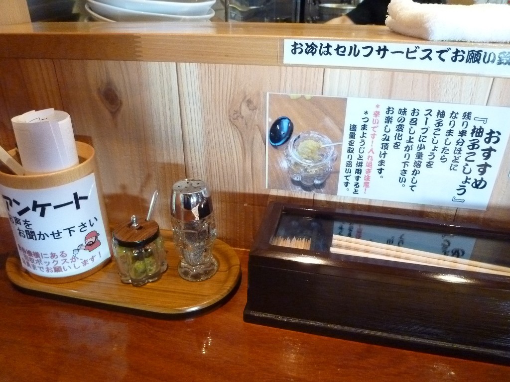 卓上の調味料は荒挽き胡椒に個性的なところで柚子こしょう。写真の説明書きにあるんですが、つま楊枝と併用すると柚子こしょうが取り出しやすいみたいです。他に『夢』がコンセプトの読み物があるんで待ってる間の時間つぶしにいいのかなと。