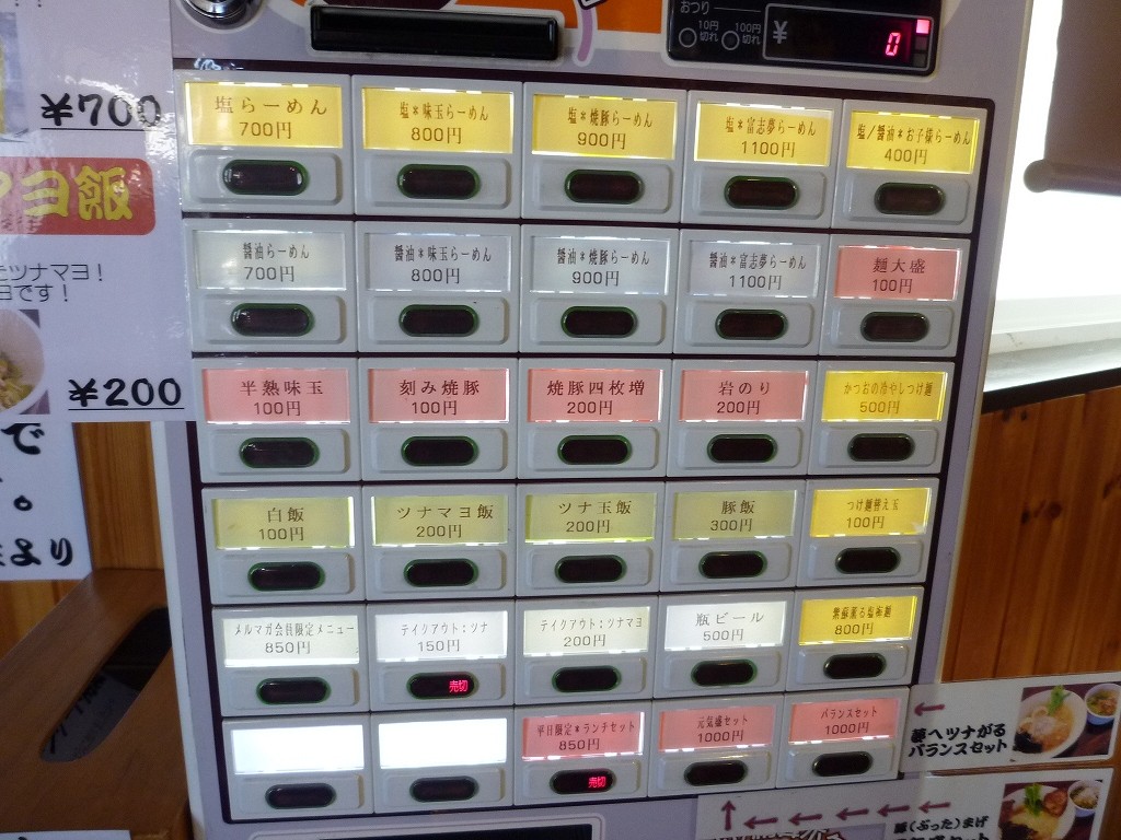 店に入って左手にある小さな券売機。魚介系と塩がウリの店ですが同額で醤油も用意されてます。2年ぶりの訪問なわけですがワンコインの醤油つけ麺に和風なメニューも増えてますね。お得なセットの内容は店頭に掲示されてるんでガッツリいきたい方はご確認をば。