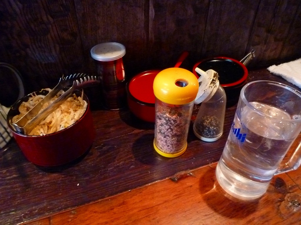 卓上には食べ放題の味付けもやしにふりかけに一味唐辛子とか胡椒とか。お冷やはジョッキでの