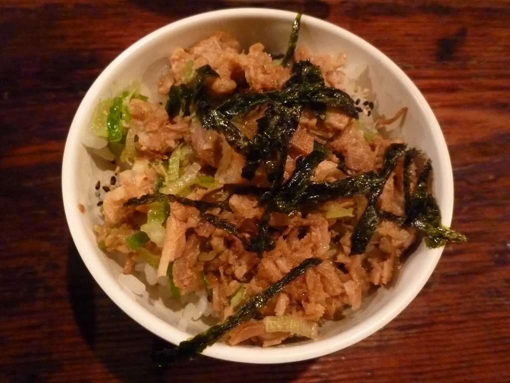 Aランチとして味玉とセットのチャーシュー丼。味玉50円チャーシュー丼50円と考えて良いんですかね。味濃いタレにまぶされたほぐしチャーシューが惜しげもなく乗せられた小丼でこれはすんごいお得です。