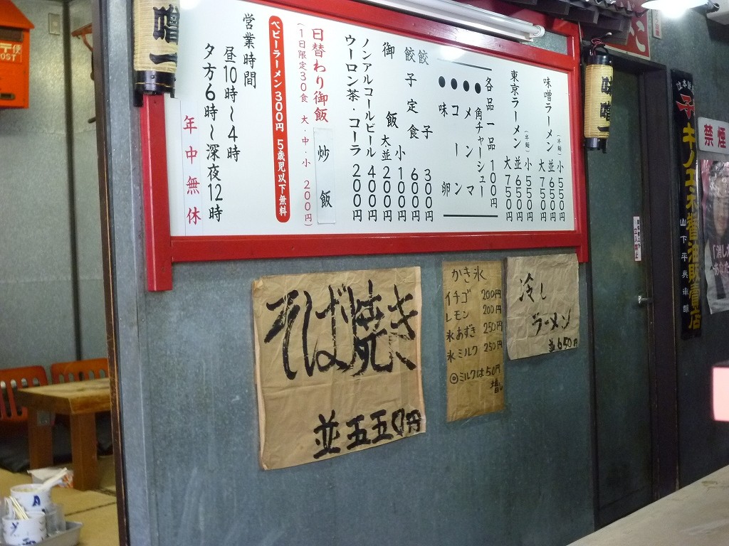 店名どおりに味噌ラーメンが筆頭で東京ラーメンとそば焼きの3本立て。特大サイズの餃子も名物で餃子定食なんてのも用意されてますね。大・中・小が同額の日替わり御飯はこの日は炒飯。他客に提供されてた大を見たんですがそれはもう笑っちゃうくらいの漫画盛りでした(笑