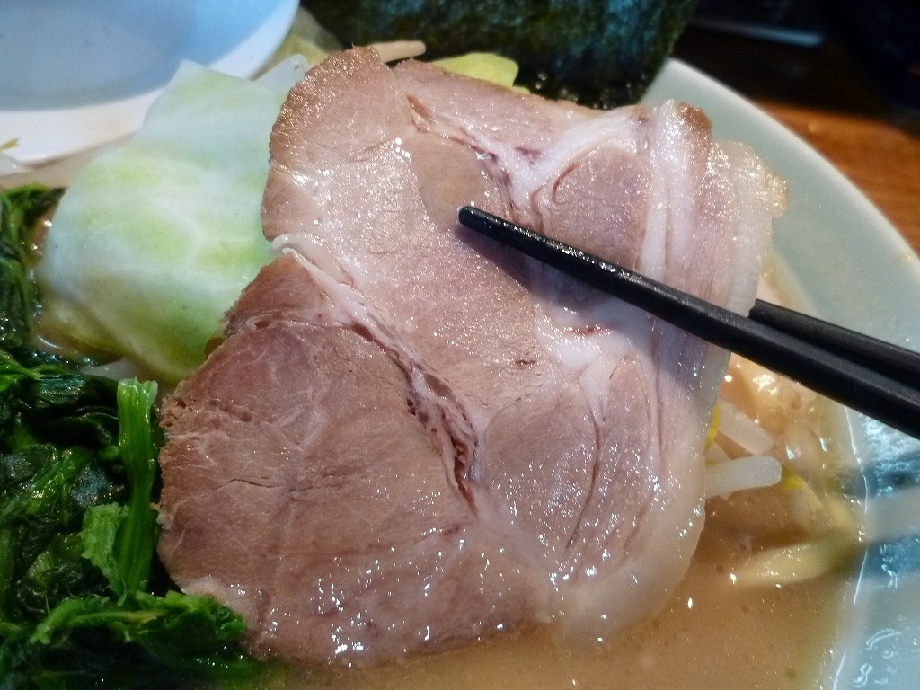 チャーシューはロースの薄切り。噛むうちにじわじわと塩気が染み出してきます。家系としてはやや大きめですか。