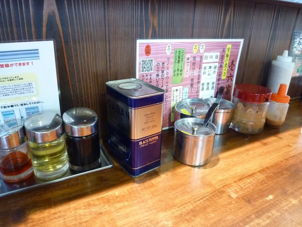 卓上調味料は壱系らしく豊富に揃ってます。餃子用なのかな?な味噌ダレっぽいのとガーリックチップが印象的でした。