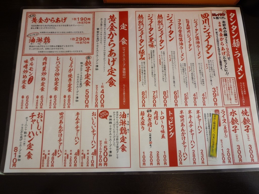 タンタン麺とからあげが大きく出てますが定食も揃っててチャーハンにも種類がありとラーメン屋というより中華屋なメニュー構成なんですね。650円と割安感のある日替わり定食に麺が入るわけでも無し。実際に定食を頼んでる方も多いように見えました。それにしても新定番とする四川ジェイタンはかなり低価格。どんな1杯なんだろう。
