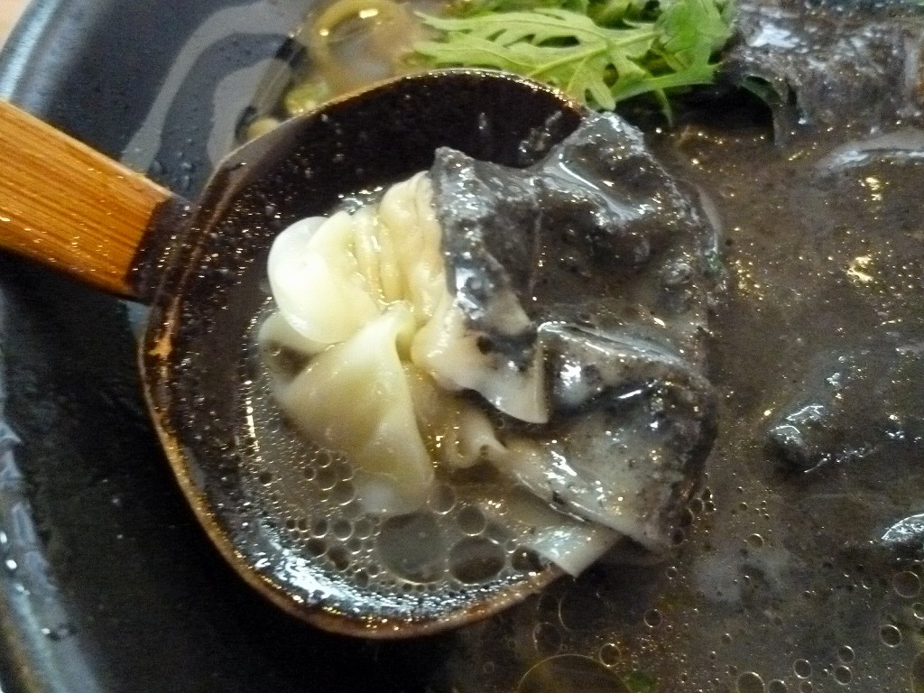 本丸亭全てのラーメンに入るワンタンは生姜の効いた味付けが秀逸。ゴマペーストがかかっちゃってたですがいつもとは一味違って面白かったです。