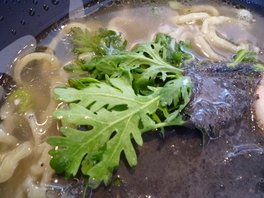春菊は生で良しスープに浸して熱を通してもまた良し。ラーメンの具としては他に見ませんが舌を新しくする効果は他に類を見ませんね。