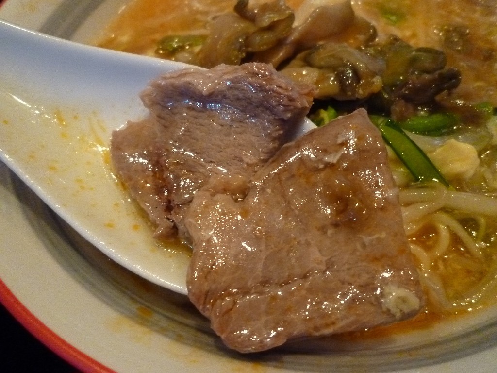 オニク系の具にはカットされた厚切りチャーシューがごろごろ。ロースなのかモモなのか部位が判然としませんでしたが柔らかな口当たりで美味しかったです。大きさが不揃いなのが逆に食感の違いを生んでます。