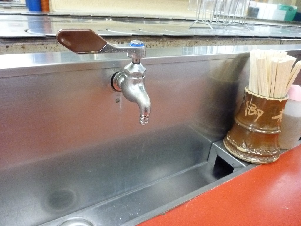 どう見ても元回転寿司だったと思えるチェーンコンベアにお茶用のお湯が出てたであろうお冷やの蛇口。大きな鏡張りになってるのは開放感を出そうとしてるんですかね。