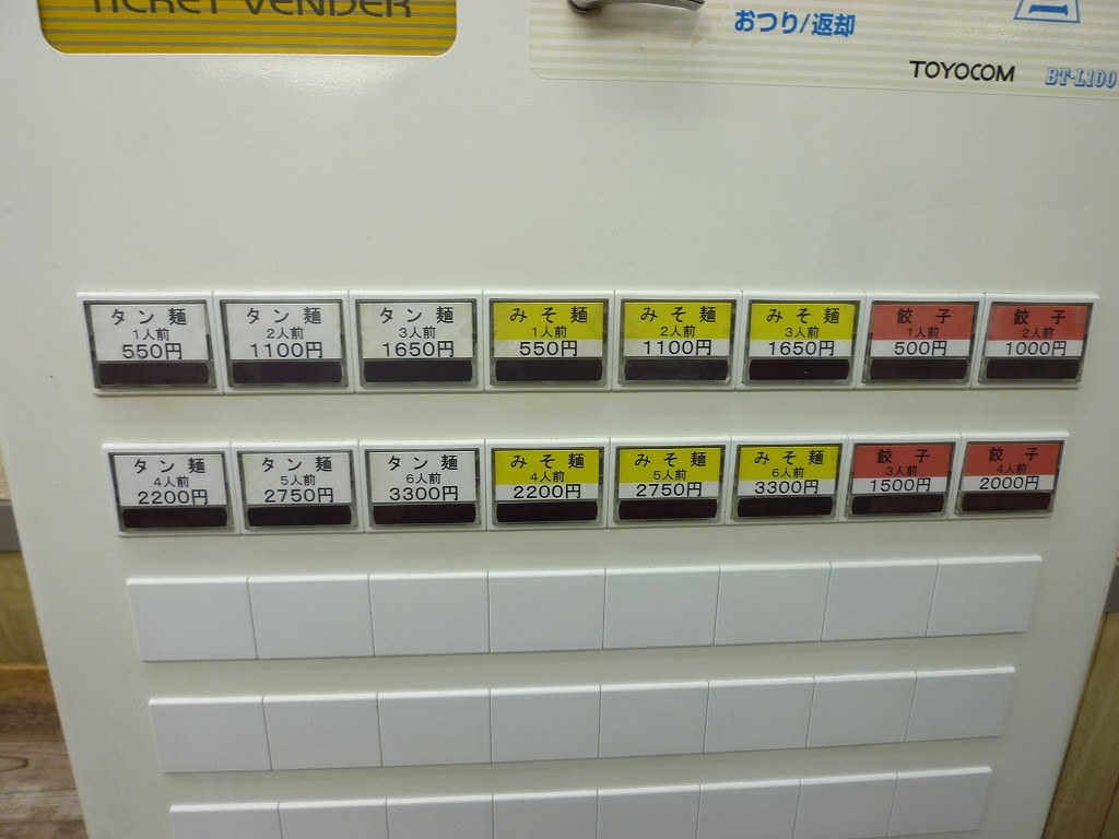他ラーメン店と共用の入り口から地下に入って左手にある券売機。タン麺とみそ麺、それに餃子のみとシンプルな構成です。