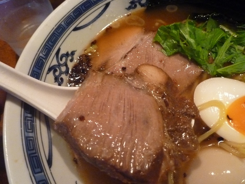 チャーシューはモモなのかな、ほとんど脂身のない部位で繊維っぽい食感ながらも筋っぽさはありません。しっとりとほぐれる食感で醤油の味付けも濃く美味しいです。