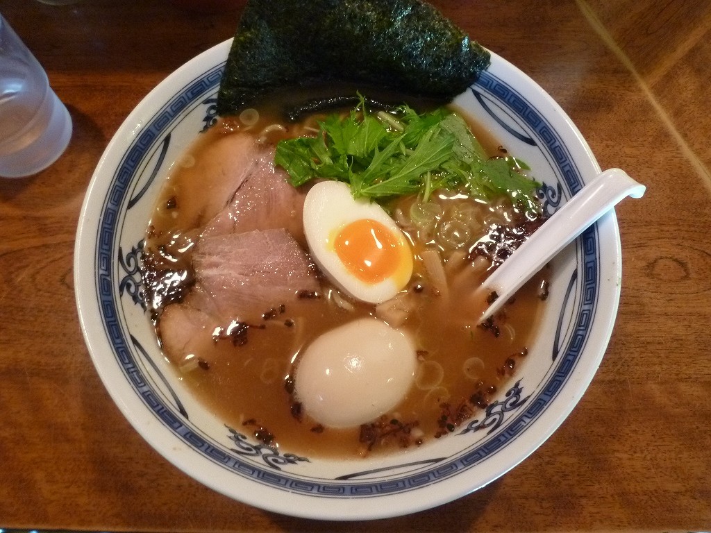 茶濁スープに焦がしネギ、中央の半味玉と緑の水菜が映えるルックスですな。