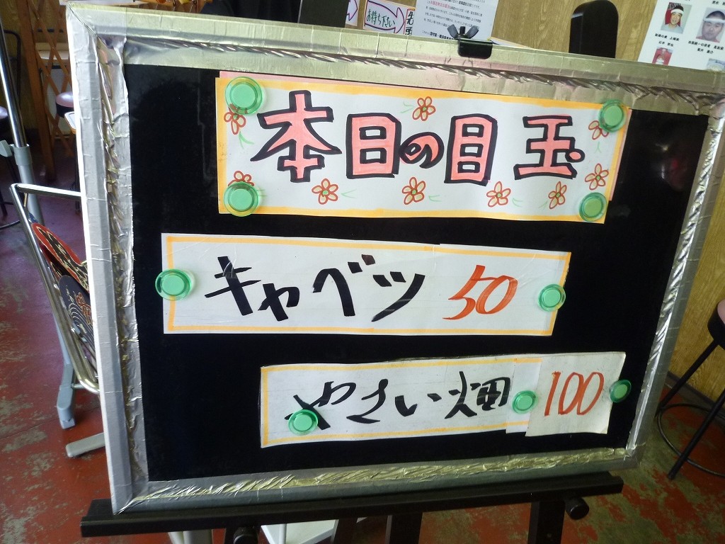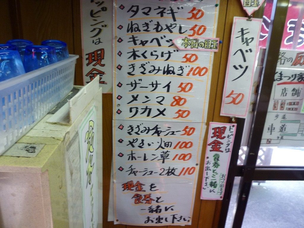 給水器横に貼られる現金野菜トッピング。食券と一緒に現金を置くことで何にするか訊いてくれます。本日の目玉、として日替わりサービストッピングも用意されてたり、ライスの食券購入で日替わり賄い小丼に変更することも可能です。