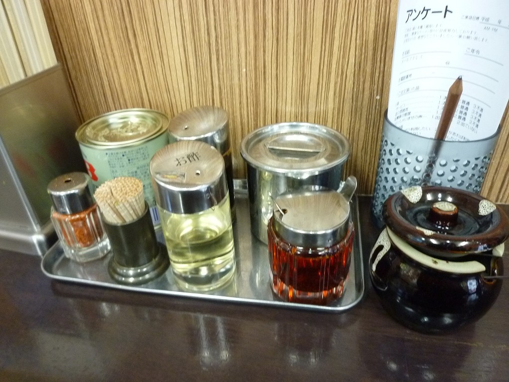卓上調味料は餃子用・味変え用の他に高菜が常備。衛生上の理由で卓上には出てませんが言えば刻み玉ねぎも出してくれます。