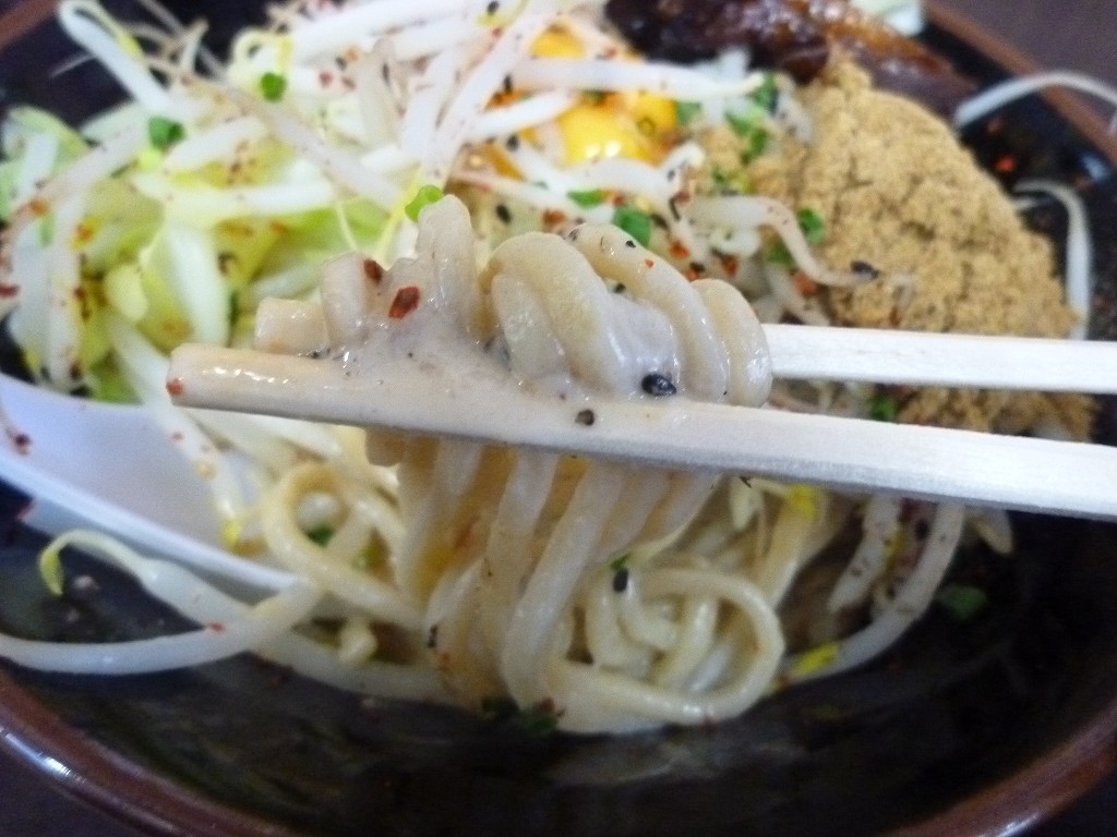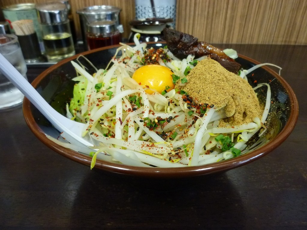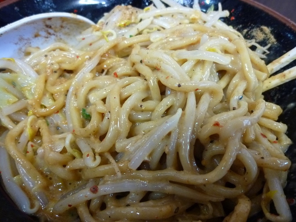 特に説明は無かったんですがこれはまぜそばだろうとグッチャグチャ。底には醤油ダレも潜んでる和洋折衷な1杯なんで混ぜすぎないほうが味の変化が楽しめていいかも。魚粉がどう影響するかが楽しみだったんですが意外なほどにすんなり馴染んで、たっぷりなもやしにキャベツも違和感なくシャキシャキ感が口直しになりました。