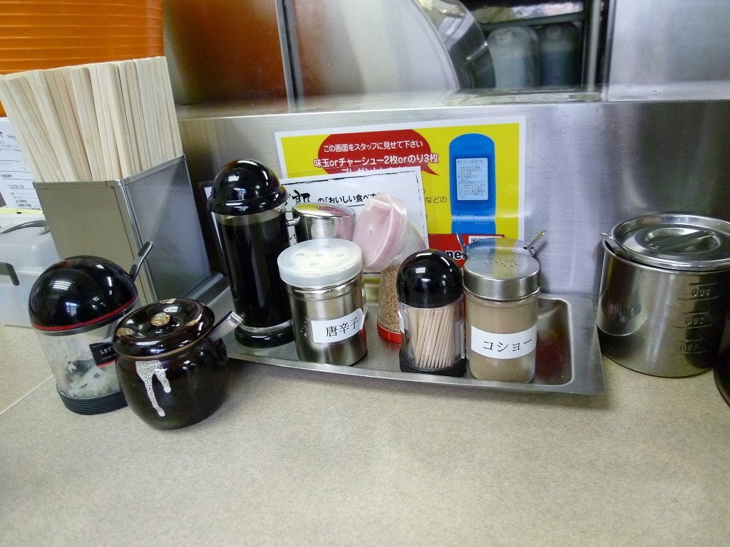 卓上には豊富な調味料に加えて高菜や刻み玉ねぎも置いてあります。