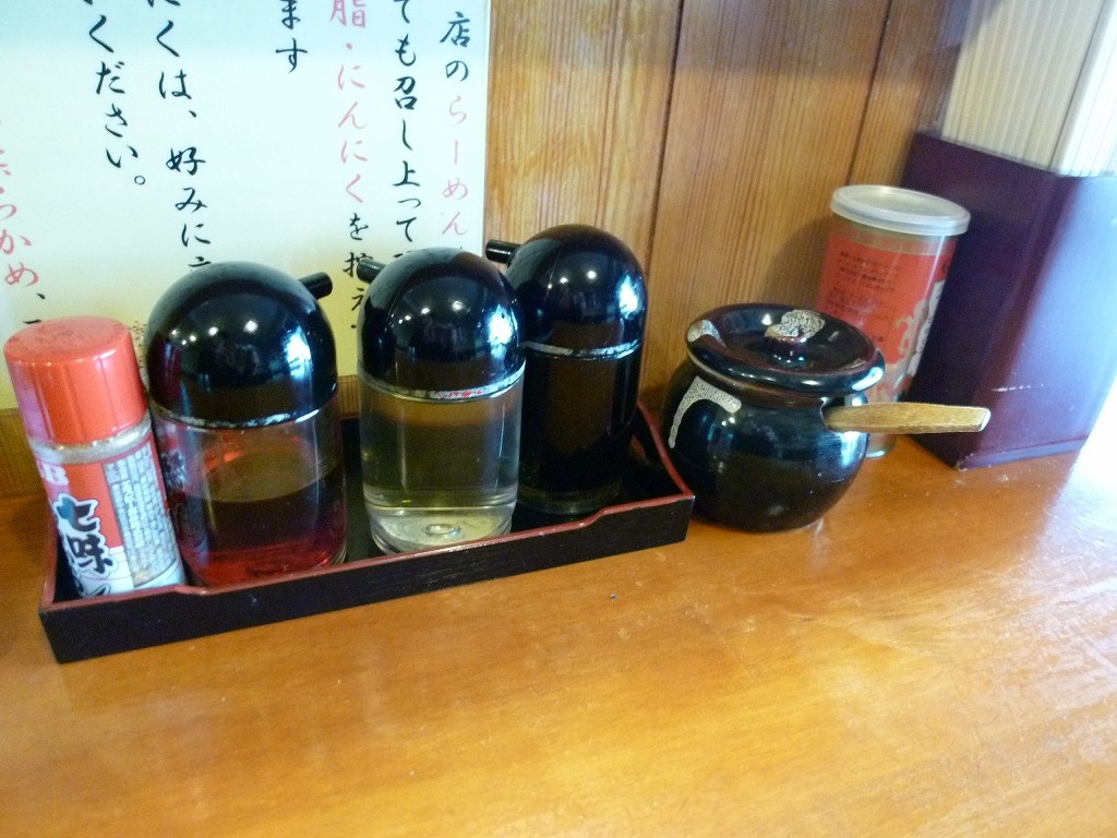 卓上には餃子用に七味に胡椒にニンニクも。こちらのラーメンは全てニンニクが控えめだそうなんでニンニクが好きな人はお好みで、ってことみたいです。