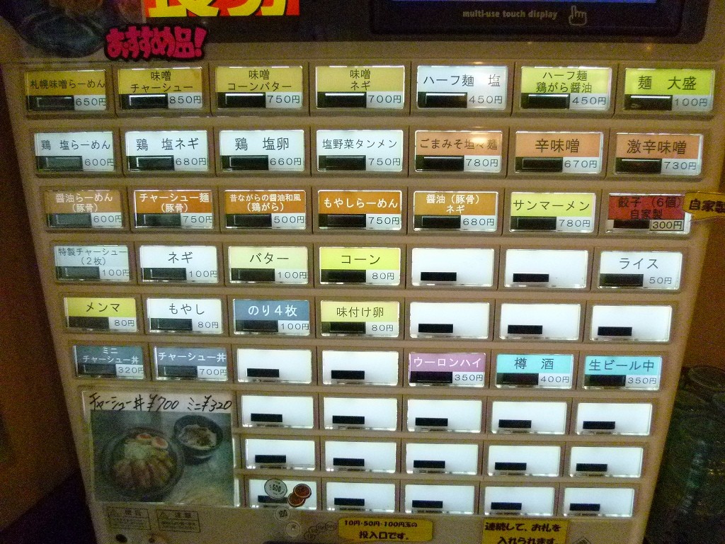 店に入って左手にある券売機。札幌味噌が基本となるんでしょうがかなり種類がありますね。券売機の周りには所狭しと写真入りのメニューが貼ってあります。