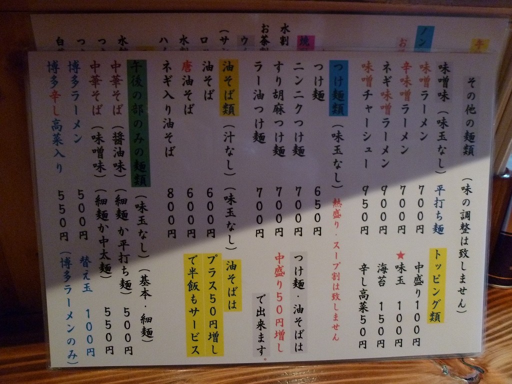 基本限定メニューの裏面。いつの間にか味噌につけ麺、油そばもやるようになってたんですね。午後の部ってのは夜の部のことみたいですが中華そばや博多ラーメンもやってるみたいです。夜の部はお酒も充実してるみたいなんで呑んだ後の〆なのかな。