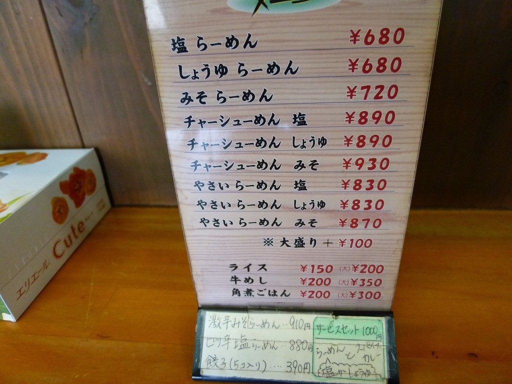 メニューは塩を筆頭に醤油に味噌。個別トッピングは見当たりませんでしたがご飯ものには牛めしや角煮ごはんなんてのもあったりして。この辺をラーメンに反映すれば選択の幅が広がって面白いと思うんですけどね。